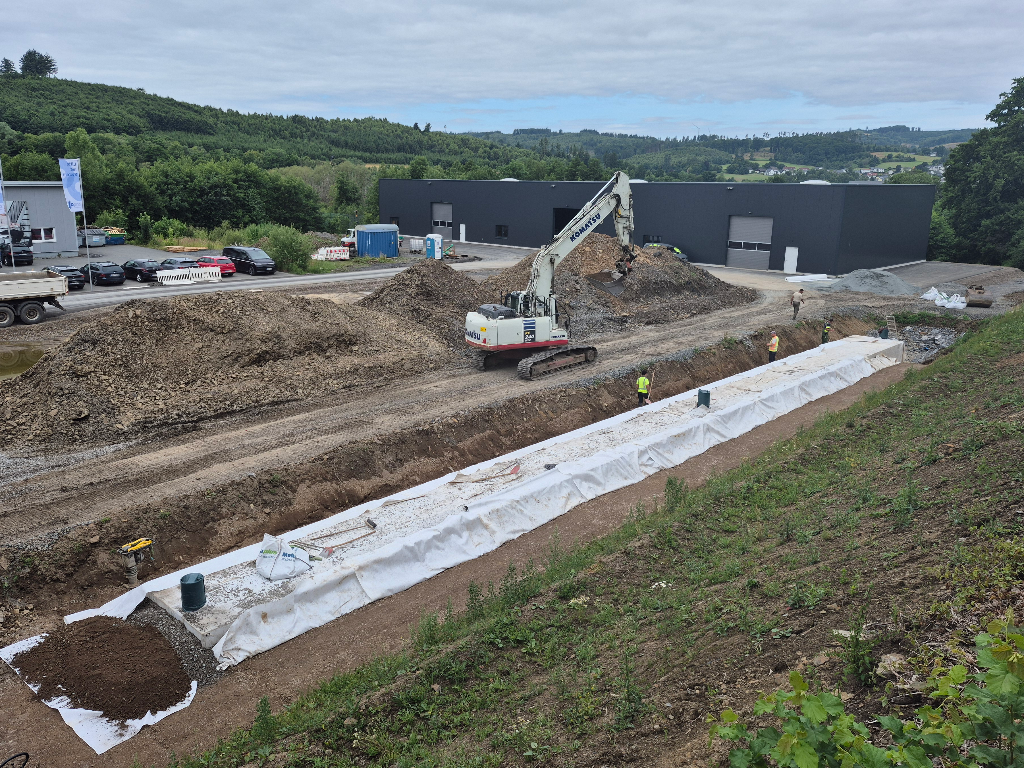 Versickerungsrigole als "All-In-One-System" für die Niederschlagwasserabläufe einer Produktionshalle